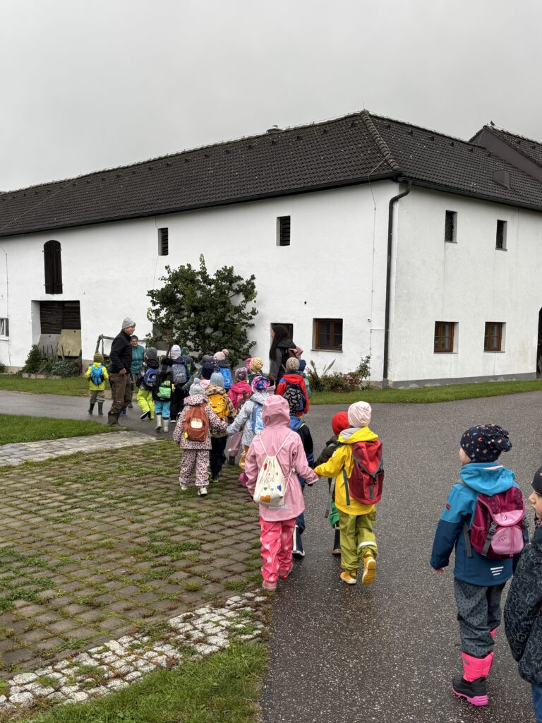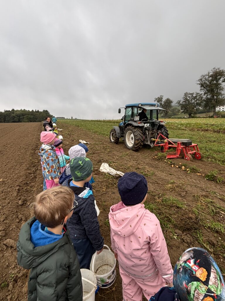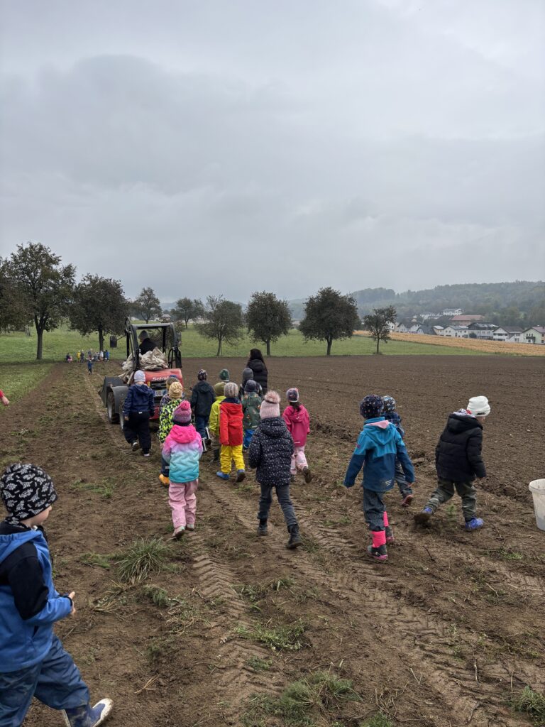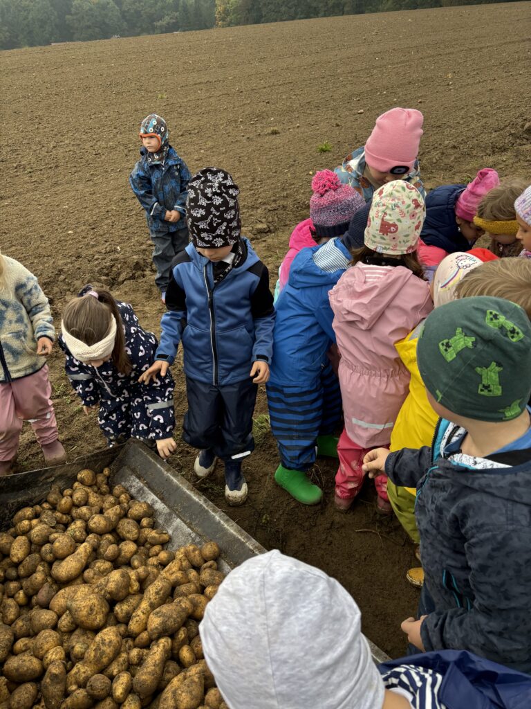 Anfang Oktober besuchten alle ersten Klassen und die Vorschulgruppe Bauer Fritz in Mittertreffling. Unter seiner Anleitung durften die Kinder die Erdäpfel ausgraben. Alle halfen begeistert mit. Zur Stärkung gab es einen Erdäpfelschmarren von Bäuerin Maria.